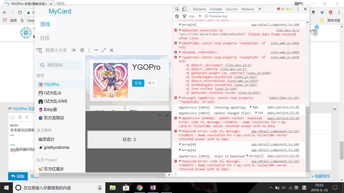 相同的错误,重装ygopro,重装mycard,挂代理,等等都没用,一样报错